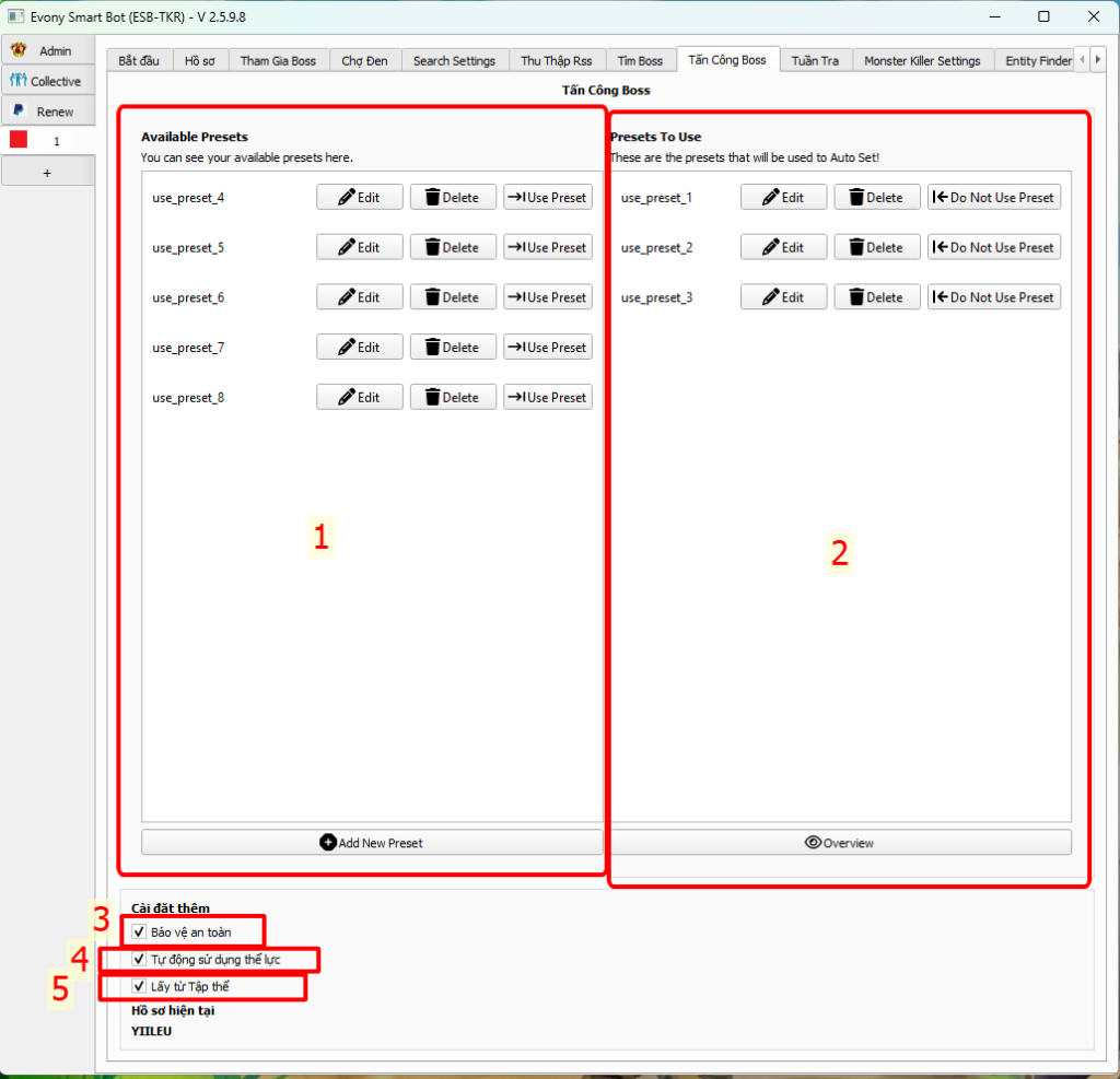 – Bot sẽ chọn cài đặt trước một cách thông minh theo ý muốn của ông chủ. Nó sẽ luôn chọn cài đặt trước tốt nhất. Ví dụ: nếu bạn có giá trị đặt trước có thể giết Trùm sự kiện 4 và giá trị đặt trước có thể giết Trùm sự kiện 2, và bạn đã sẵn sàng để đặt Trùm sự kiện 1, nó sẽ chọn giá trị đặt trước có thể giết Trùm sự kiện 2, vì vậy mà bạn có thể lưu giá trị đặt trước đó cho một ông chủ mạnh hơn.