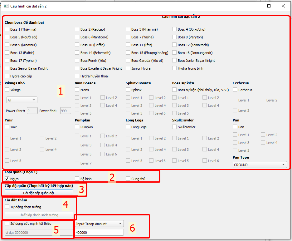 – Nếu một con trùm không tồn tại vì nó đã bị giết, nó sẽ bị xóa khỏi hàng đợi. - Số lượng quân do bạn quyết định: Cài đặt Tổng số lượng quân do bạn quyết định, tài khoản của bạn có thể làm gì để tiêu diệt những tên trùm mà bạn đã chọn. Hãy biết tự lượng sức mình!